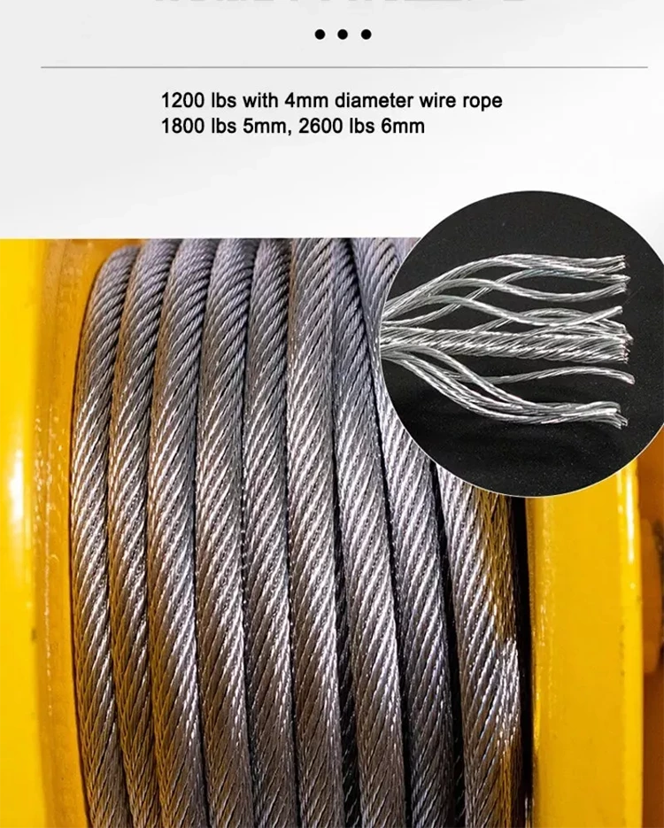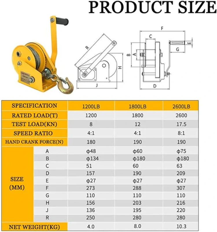 Vi erbjuder 1200 lb, 1800 lb och 2600 lb vanliga laststorlekar för att matcha repdiametrar. Det kraftfulla bromssystemet ger dig exakt kontroll över lyft och landning av tunga föremål, vilket gör att du kan placera tunga föremål långsamt och smidigt utan risk för plötsliga fall.