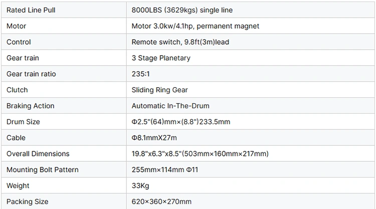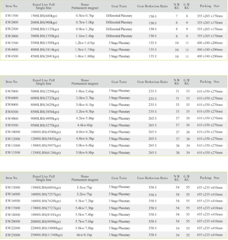 1. Den använder en lindad motor i 12/24V-serien, ger stark spänning och snabb linjär hastighet och uppfyller kraven för olika tunga förhållanden.